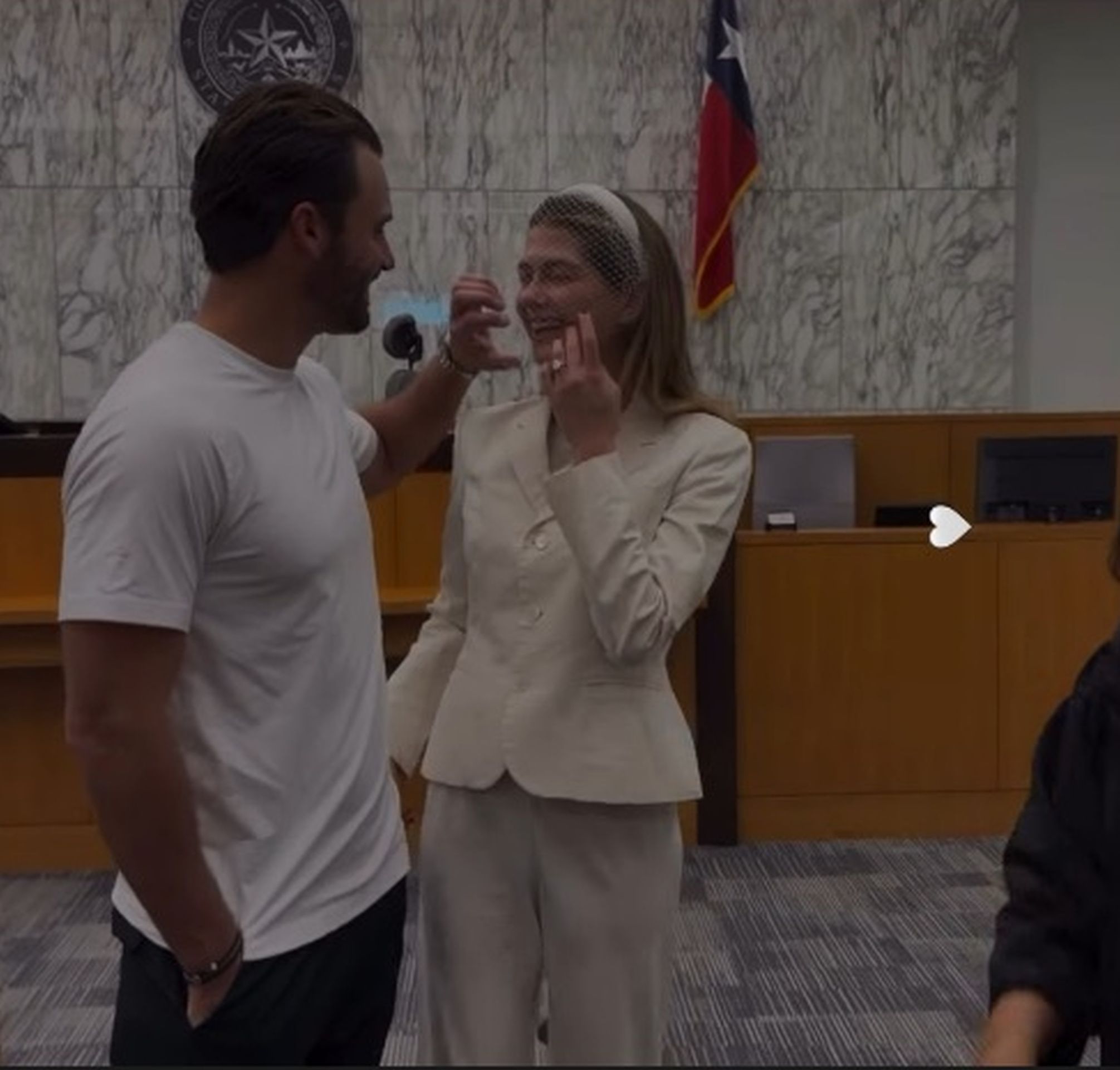 Η 27χρονη δημοσίευσε σε story στο προσωπικό της λογαριασμό στο Instagram μια φωτογραφία όπου φορά ένα άσπρο βέλο και την στιγμή που φιλά τον σύντροφό της μετά το γάμο. Η ίδια επέλεξε για την τελετή να φορέσει ένα off white κοστούμι, ενώ δίνει ένα τρυφερό φιλί στον σύζυγό της.