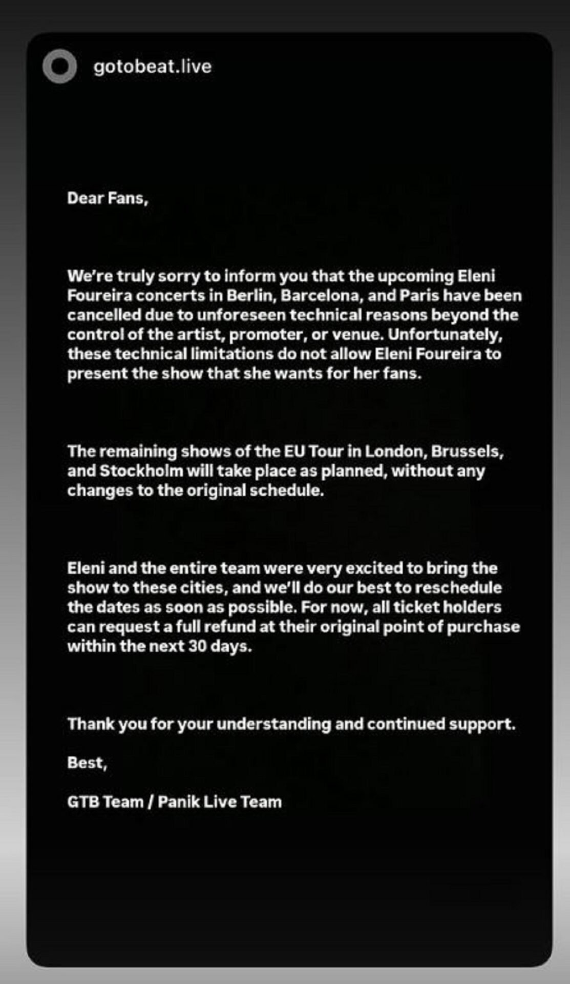 «Αγαπητοί fans, σας ενημερώνουμε μετά λύπης ότι οι επερχόμενες συναυλίες της Ελένης Φουρέιρα σε Βερολίνο, Βαρκελώνη και Παρίσι ακυρώνονται. Λόγω απρόβλεπτων τεχνικών λόγων, πέρα από τον έλεγχο της καλλιτέχνιδας, του διοργανωτή ή του χώρου.