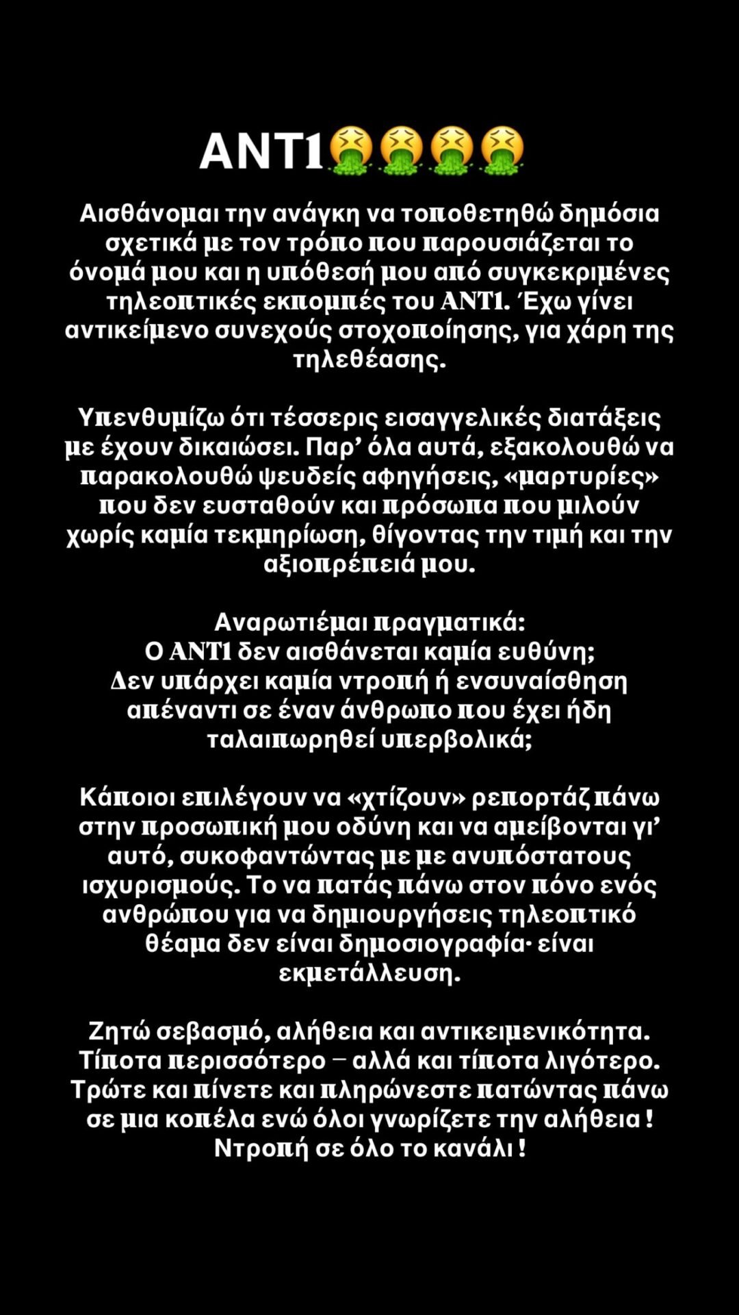 «Αισθάνομαι την ανάγκη να τοποθετηθώ δημόσια σχετικά με τον τρόπο που παρουσιάζεται το όνομά μου και η υπόθεσή μου από συγκεκριμένες τηλεοπτικές του ΑΝΤ1. Έχω γίνει αντικείμενο συνεχούς στοχοποίησης, για χάρη της τηλεθέασης.