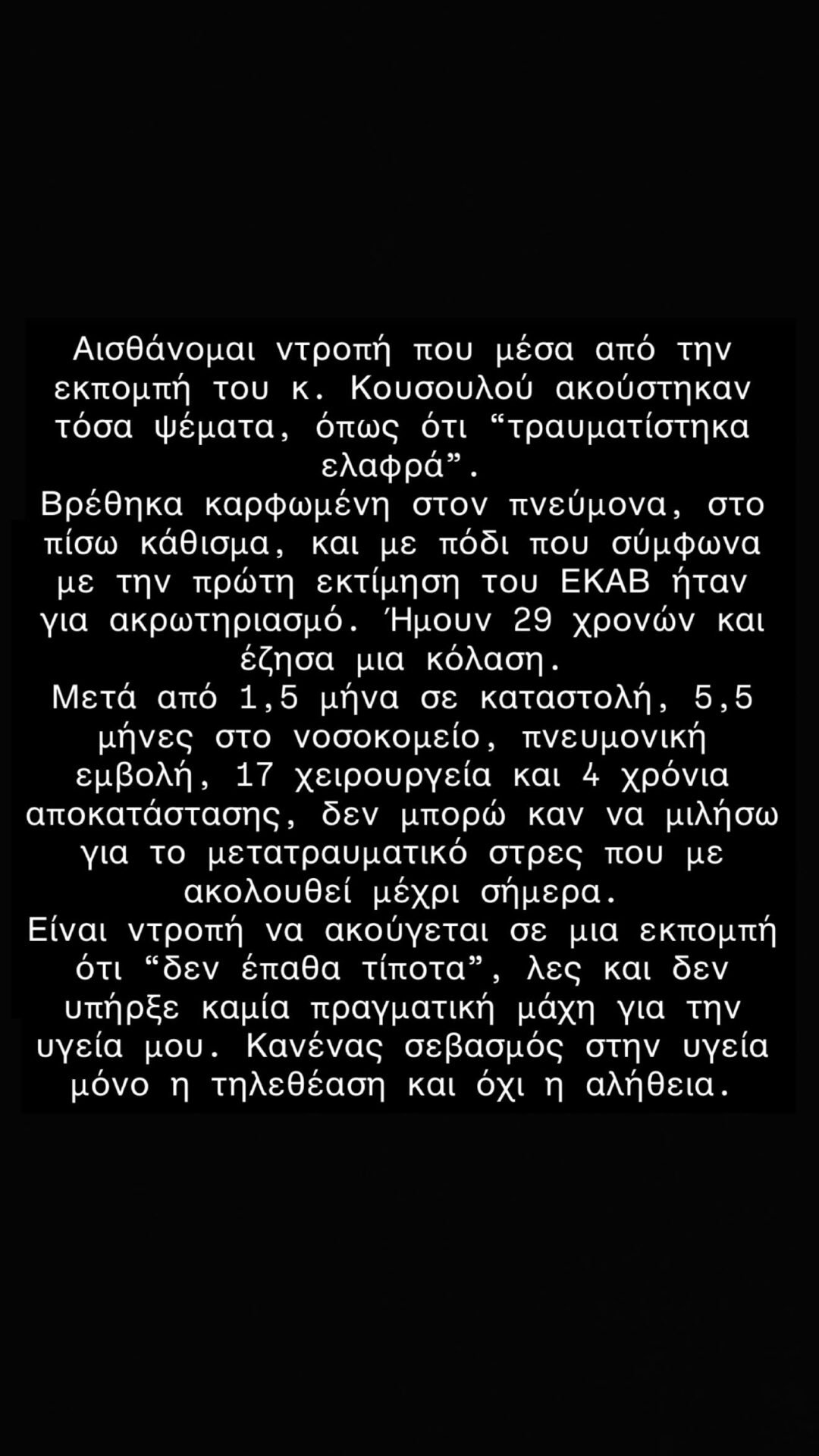 Κάποιοι επιλέγουν να «χτίζουν» ρεπορτάζ πάνω στην προσωπική μου οδύνη και αμείβονται γι’αυτό, συκοφαντώντας με με ανυπόστατους ισχυρισμούς. Το να πατάς πάνω στον πόνο ενός ανθρώπου για να δημιουργείς τηλεοπτικό θέαμα δεν είσαι δημοσιογράφος· είναι εκμετάλλευση.