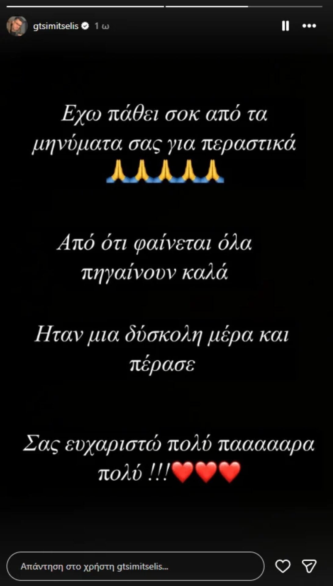 «Έχω πάθει σοκ από τα μηνύματα σας για περαστικά. Από ότι φαίνεται όλα πηγαίνουν καλά. Ήταν μία δύσκολη μέρα και πέρασε. Σας ευχαριστώ πολύ, πάρα πολύ», ανέφερε ο Τσιμιτσέλης στην ανάρτησή του, ενημερώνοντας τους fans του για την κατάσταση της υγείας του και ευχαριστώντας τους, παράλληλα, για τις ευχές και τα μηνύματα στήριξης.