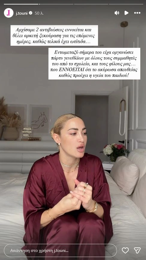 Αρχίσαμε δύο αντιβιώσεις το πρωί και θέλει αρκετή ξεκούραση για τις επόμενες ημέρες, καθώς τελικά έχει ωτίτιδα. Εν τω μεταξύ του είχα οργανώσει σήμερα πάρτι γενεθλίων με όλους τους συμμαθητές του από το σχολείο και τους φίλους μας που εννοείται το ακύρωσα απευθείας καθώς προέχει η υγεία του παιδιού!» γράφει η Ιωάννα Τούνη στα Instagram Stories της.