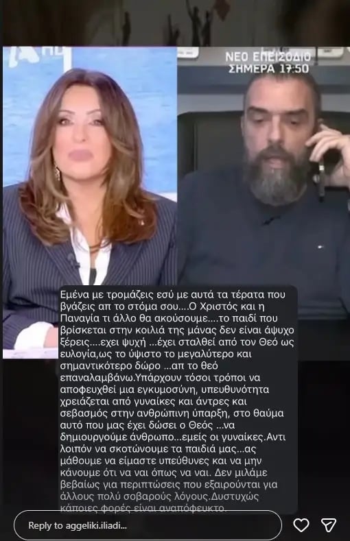 Υπάρχουν τόσοι τρόποι να αποφευχθεί μια εγκυμοσύνη, υπευθυνότητα χρειάζεται από γυναίκες και άντρες και σεβασμός στην ανθρώπινη ύπαρξη, στο θαύμα αυτό που μας έχει δώσει ο Θεός, να δημιουργούμε άνθρωπο… εμείς οι γυναίκες. Αντί λοιπόν να σκοτώνουμε τα παιδιά μας… ας μάθουμε να είμαστε υπεύθυνες και να μην κάνουμε ό,τι να ’ναι. Δεν μιλάμε βεβαίως για περιπτώσεις που θεωρούνται για άλλους πολύ σοβαρούς λόγους. Δυστυχώς κάποιες φορές είναι αναπόφευκτο», έγραψε η Αγγελική Ηλιάδη.