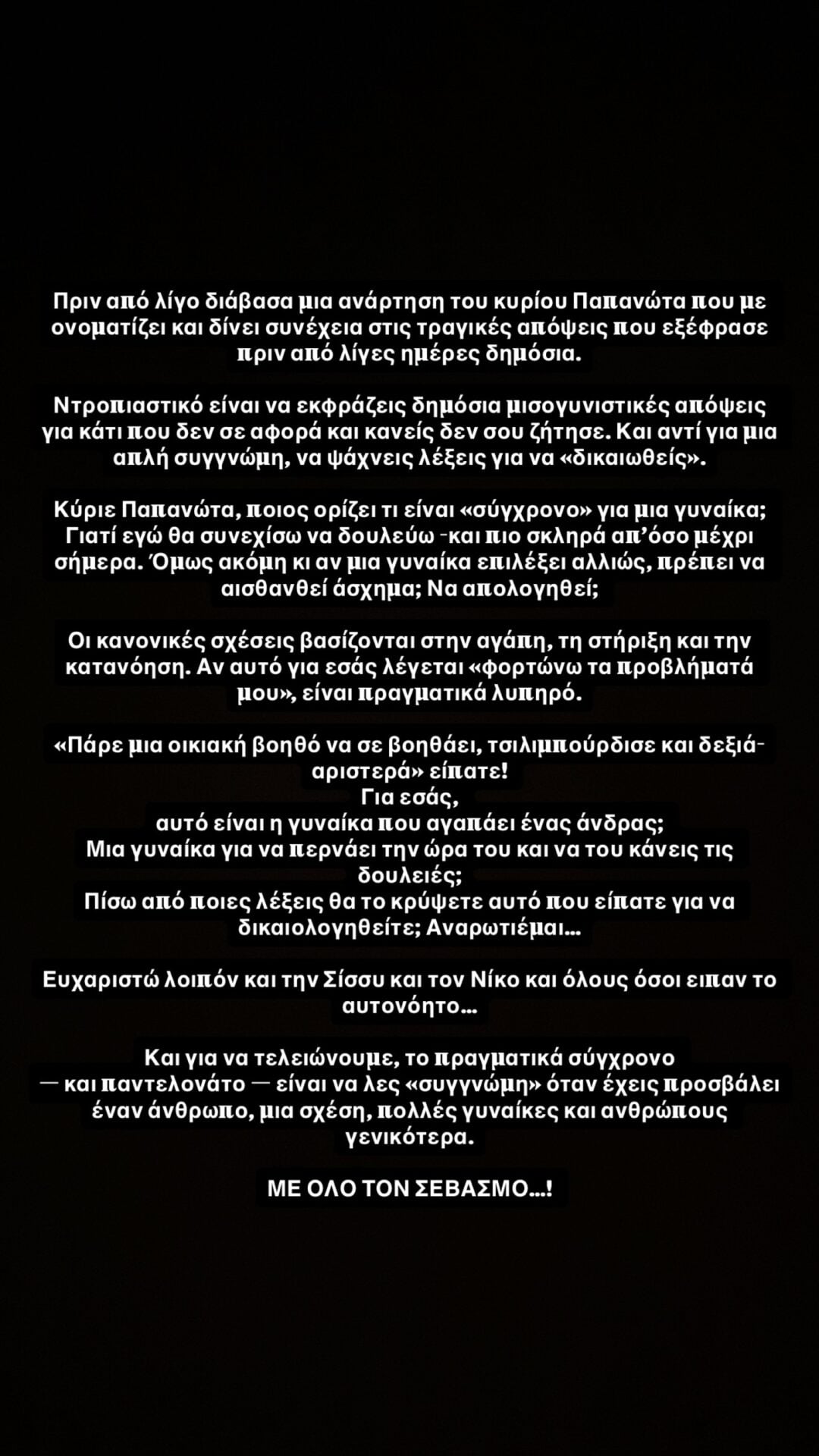Ευχαριστώ λοιπόν και την Σίσσυ και τον Νίκο και όλους όσοι είπαν το αυτονόητο… Και για να τελειώνουμε, το πραγματικά σύγχρονο – και παντελονάτο – είναι να λες «συγγνώμη» όταν έχεις προσβάλει έναν άνθρωπο, μια σχέση, πολλές γυναίκες και ανθρώπους γενικότερα. ΜΕ ΟΛΟ ΤΟΝ ΣΕΒΑΣΜΟ», έγραψε η Ελένη Βουλγαράκη.