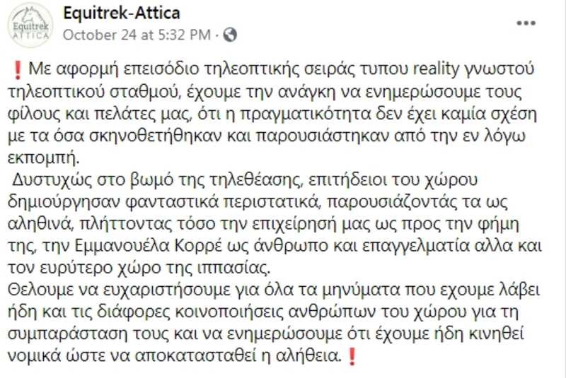 Η εταιρία Equitrek – Attica, που παραχώρησε το χώρο αλλά και τα ζώα, ανάρτησε στο Facebook, μία ανακοίνωση στην οποία δήλωσε πως διαφωνεί πλήρως με όσα φάνηκαν και ότι ήδη θα κινηθούν νομικά έτσι ώστε να αποκατασταθεί η αλήθεια.
