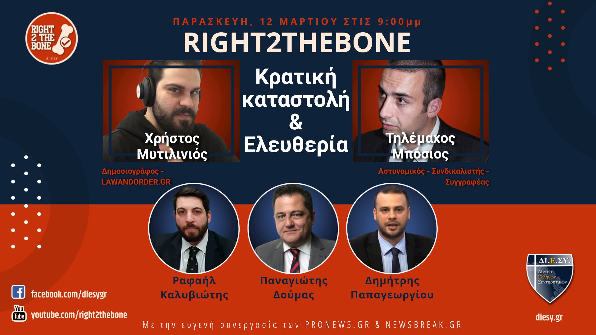 Προσκεκλημένοι του Δικτύου Ελλήνων Συντηρητικών στο κανάλι #RIGHT2THEBONE​ ο δημοσιογράφος του LAWANDORDER.GR, Χρήστος Μυτιλινιός και ο αστυνομικός της ΕΛ.ΑΣ., συνδικαλιστής και συγγραφέας Τηλέμαχος Μπόσιος.
