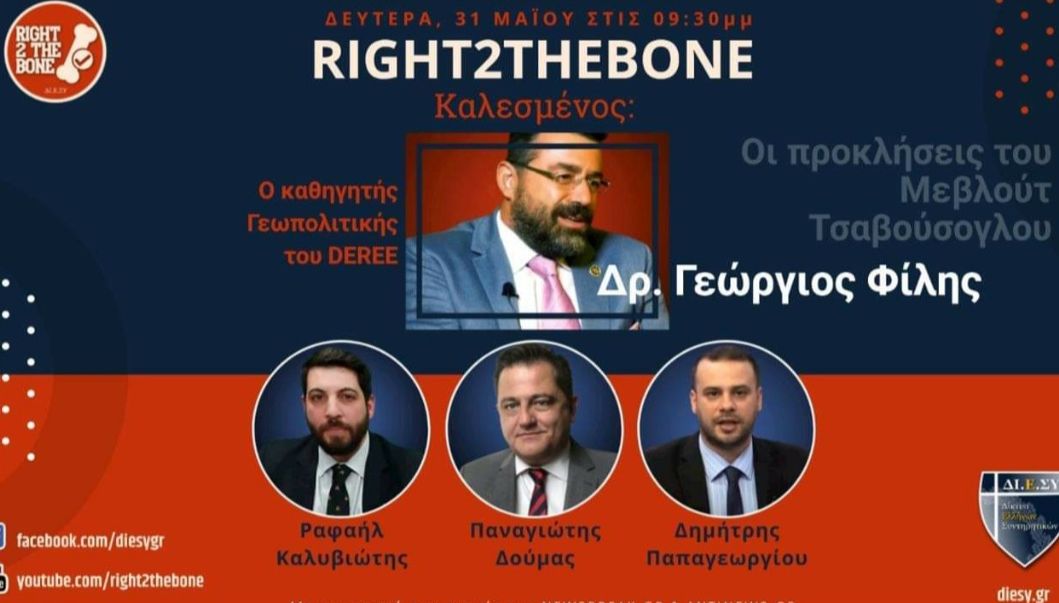 Αποψινός προσκεκλημένος στην τακτική εκπομπή του RIGHT2THEBONE στις 21.15 είναι ο καθηγητής γεωπολιτικής του DEREE, της Σχολής Εθνικής Αμύνης (ΣΕΘΑ) και του Πανεπιστημίου Αθηνών Δρ. Γεώργιος Φίλης. Συζητάμε για τις νέες προκλήσεις Τσαβούσογλου.