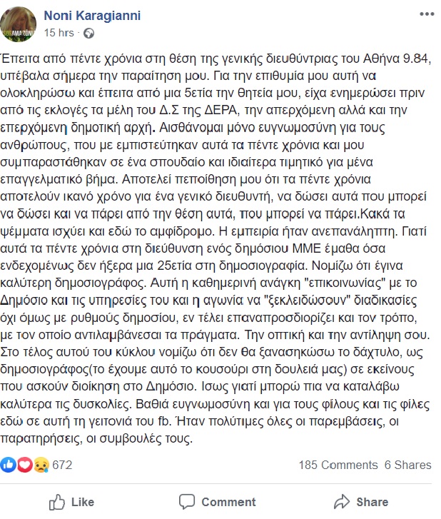 Σαν βόμβα έσκασε η παραίτηση της Νόνης Καραγιάννη από τη διεύθυνση του δημοτικού ραδιοσταθμού «Αθήνα 9,84» την οποία ανακοίνωσε μέσα από τον προσωπικό της λογαριασμό στα σόσιαλ μίντια.