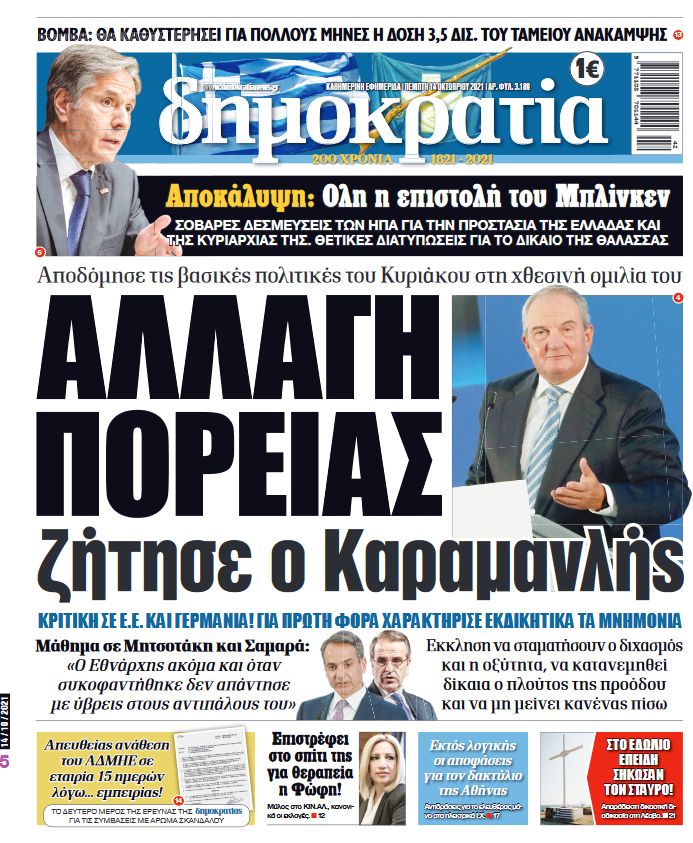 Σήμερα στη «δημοκρατία»: Αποδόμησε τις βασικές πολιτικές του Κυριάκου στη χθεσινή ομιλία του – Κριτική σε ΕΕ και Γερμανία! – Για πρώτη φορά χαρακτήρισε εκδικητικά τα μνημόνια – Μάθημα σε Μητσοτάκη και Σαμαρά:«Ο Εθνάρχης ακόμα και όταν συκοφαντήθηκε δεν απάντησε με ύβρεις στους αντιπάλους του» – Έκκληση να σταματήσουν ο διχασμός και η οξύτητα, να κατανεμηθεί δίκαια ο πλούτος της προόδου και να μη μείνει κανένας πίσω.