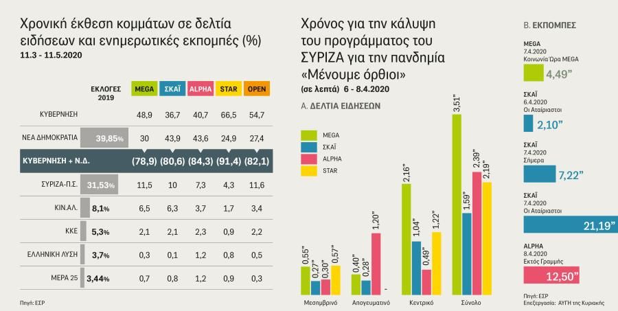 Στην έρευνα του ΕΣΡ, μπορεί κανείς να διαπιστώσει την μεγάλη διαφορά στον χρόνο κάλυψης των δραστηριοτήτων της κυβέρνησης από τα κανάλια, σε σύγκριση με την αξιωματική αντιπολίτευση και τα υπόλοιπα κόμματα. Μάλιστα, σημειώνεται ότι το ΕΣΡ κάλεσε την πλειοψηφία των καναλιών εθνικής εμβέλειας να δώσουν εξηγήσεις για την ενημέρωση που παρείχαν κατά την διάρκεια της πρώτης καραντίνας.