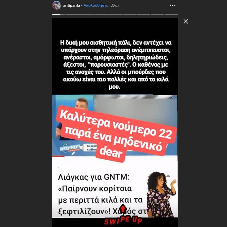 Ο γνωστός παρουσιαστής άρχισε τα επικριτικά σχόλια για την κοπέλα και … το «είδος» της λέγοντας: «Οφείλω εγώ να τη δω γυμνή στην παραλία, με τα παραπάνω κιλά; Δε θέλω να τη δω γατί αυτή δεν θα γίνει ποτέ μοντέλο. Γιατί αυτό με το plus size πολύ ωραία καραμέλα».