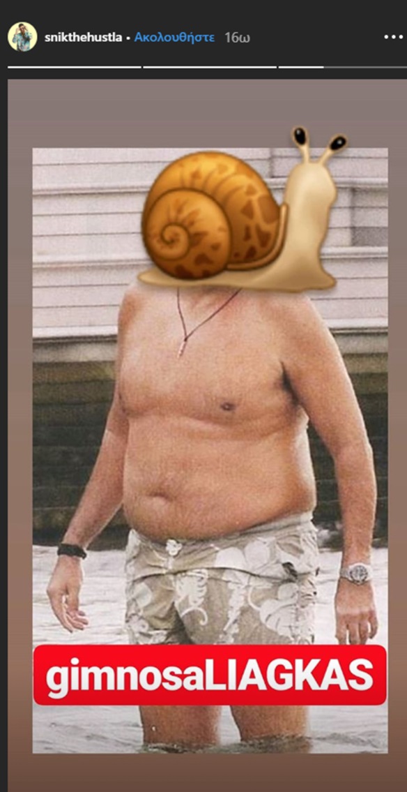 Πιο συγκεκριμένα ο Snik ανέβασε μια φωτογραφία του Γιώργου Λιάγκα με μαγιό στο Instagram, καλύπτοντας το κεφάλι του με ένα σαλιγκάρι.