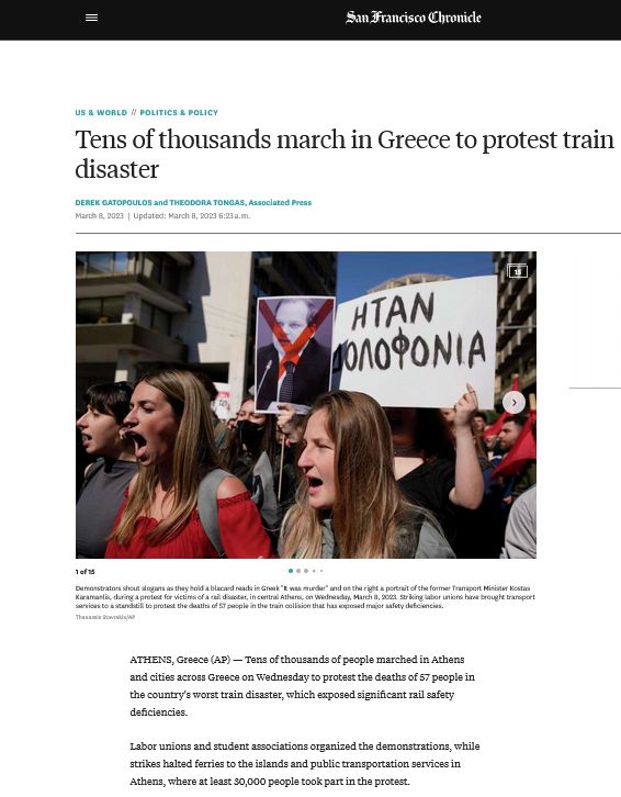 Politico: Ο Μητσοτάκης αντιμετωπίζει τις μεγαλύτερες διαμαρτυρίες της Ελλάδας από την κρίση στην ευρωζώνηGuardian: «Η Ελλάδα εκτροχιάστηκε»: δεκάδες χιλιάδες οργισμένοι διαδηλωτές για την καταστροφή των τρένωνReuters: Δεκάδες χιλιάδες διαδηλώνουν στην Ελλάδα σε οργισμένη διαμαρτυρία για το δυστύχημα του τρένουBBC: Σιδηροδρομικό δυστύχημα στην Ελλάδα: Χιλιάδες διαδηλωτές ζητούν επενδύσεις στο σύστημα μεταφορώνIndependent: Η Ελλάδα διαμαρτύρεται: Οι απεργίες σταματούν τις μεταφορές καθώς χιλιάδες διαδηλώνουν για το ατύχημα του τρένουNewsmax.com: Μεγάλες συγκεντρώσεις διαμαρτυρίας σε εξέλιξη στην Ελλάδα μετά την σιδηροδρομική καταστροφήGMA: Πάνω από 50.000 διαδηλωτές στην Ελλάδα για τη σιδηροδρομική τραγωδίαSan Francisco Chronicle: Δεκάδες χιλιάδες διαδηλώνουν στην Ελλάδα για να διαμαρτυρηθούν για την καταστροφή των τρένωνFrance24: Δεκάδες χιλιάδες διαδηλώνουν στην Ελλάδα για την πιο θανατηφόρα καταστροφή με τρένα της χώραςAnadolu: Εντείνονται οι διαδηλώσεις στην Ελλάδα για το θανατηφόρο σιδηροδρομικό δυστύχημαTheSouthAfrican: Ελλάδα: Πάνω από 50.000 διαμαρτύρονται για τη σιδηροδρομική τραγωδίαTVP World: 60 χιλιάδες διαδήλωσαν στην Ελλάδα μετά το θανατηφόρο σιδηροδρομικό δυστύχημα