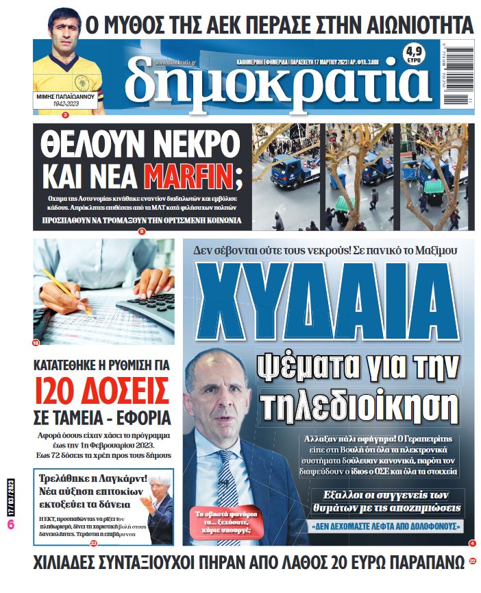 Διαβάστε σήμερα στη «δημοκρατία»: Δεν σέβονται ούτε τους νεκρούς! – Σε πανικό το Μαξίμου – Άλλαξαν πάλι αφήγημα! – Ο Γεραπετρίτης είπε στη Βουλή ότι όλα τα ηλεκτρονικά συστήματα δούλευαν κανονικά, παρότι τον διαψεύδουν ο ίδιος ο ΟΣΕ και όλα τα στοιχεία – Έξαλλοι οι συγγενείς των θυμάτων με τις αποζημιώσεις.