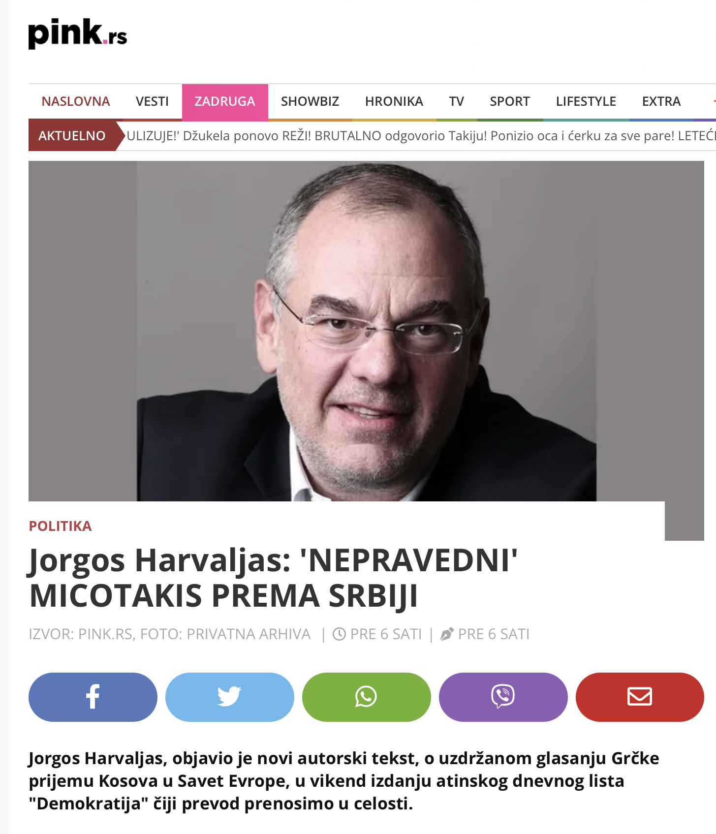 Με αυτό το άρθρο και την έκταση που πήρε στα σερβικά ΜΜΕ, ο Χαρβαλιάς έσωσε κυριολεκτικά την τιμή της Ελλάδας και των Ελλήνων, καθώς οι Σέρβοι αδελφοί μας κατάλαβαν ότι ο Μητσοτάκης δεν εκπροσωπεί παρά ένα ελάχιστο ποσοστό του λαού που δυστυχώς διοικεί.