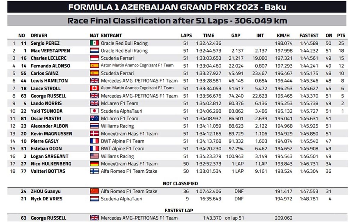 Η τελική κατάταξη του 4ου Grand Prix στο Αζερμπαϊτζάν έχει ως εξής: