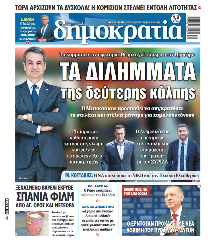 Διαβάστε σήμερα στη «δημοκρατία»: Τα κόμματα στην αφετηρία – Οι αρχηγοί σήμερα στην Πρόεδρο – Ο Μητσοτάκης προσπαθεί να συγκρατήσει τα στελέχη και στέλνει μήνυμα για χαμηλούς τόνους – Ο Τσίπρας με καθυστέρηση ζήτησε συγγνώμη και ψέλλισε τις πρώτες λέξεις αυτοκριτικής – Ο Ανδρουλάκης επέστρεψε την εντολή και ετοιμάζεται για «μάχη» με τον ΣΥΡΙΖΑ.