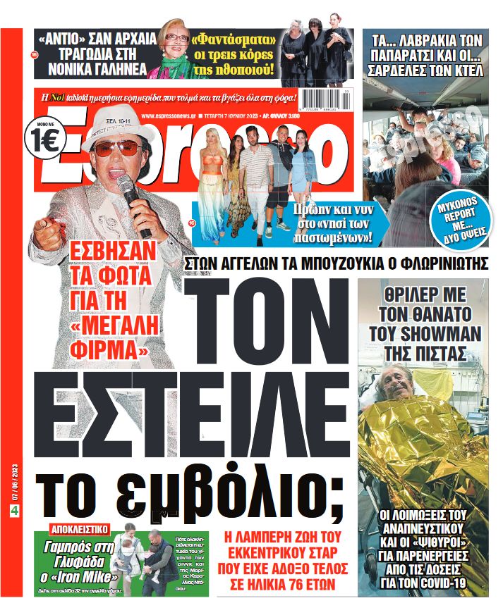 Διαβάστε στην «Espresso»: Έσβησαν τα φώτα για τη «μεγάλη φίρμα» – Στων αγγέλων τα μπουζούκια ο Φλωρινιώτης – Η λαμπερή ζωή του εκκεντρικού σταρ που που είχε άδοξο τέλος σε ηλικία 76 ετών – Θρίλερ με τον θάνατο του showman της πίστας – Οι λοιμώξεις του αναπνευστικού και οι «ψίθυροι» για παρενέργειες από τις δόσεις για τον Covid-19.