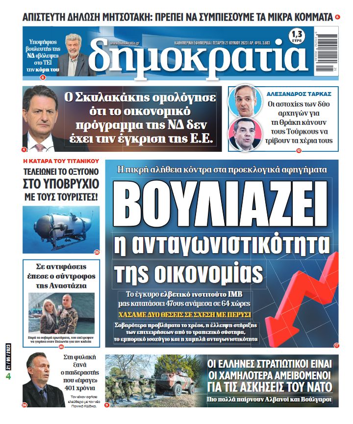 Διαβάστε σήμερα στη «δημοκρατία»: Η πικρή αλήθεια κόντρα στα προεκλογικά αφηγήματα – Το έγκυρο ελβετικό ινστιτούτο IMB μας κατατάσσει 47ους ανάμεσα σε 64 χώρες – Χάσαμε δύο θέσεις σε σχέση με πέρυσι – Σοβαρότερα προβλήματα το χρέος, η έλλειψη στήριξης των επιχειρήσεων από το τραπεζικό σύστημα, το εμπορικό ισοζύγιο και η χαμηλή ανταγωνιστικότητα.