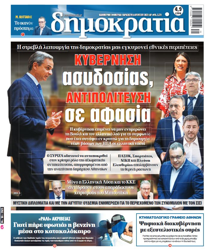 Διαβάστε σήμερα στη «δημοκρατία»: Η στρεβλή λειτουργία της δημοκρατίας μας εγκυμονεί εθνικές περιπέτειες – Η κυβέρνηση επιμένει να μην ενημερώνει τη Βουλή και τον ελληνικό λαό για τη συμφωνία που έχει συνάψει εν κρυπτώ για τη δημιουργία νέων βάσεων των ΗΠΑ σε ελληνικά νησιά – Μόνο η Ελληνική Λύση και το ΚΚΕ αντέδρασαν στους απαράδεκτους χειρισμούς του Μητσοτάκη.