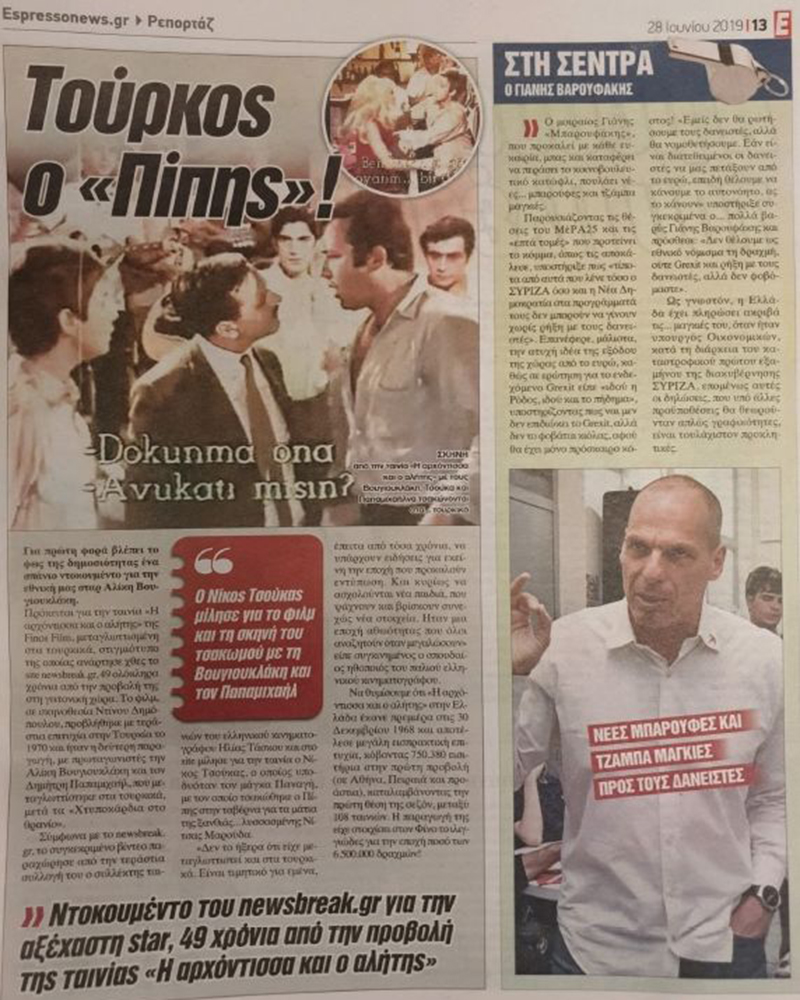 Το αποκλειστικό θέμα του newsbreak.gr που παρουσιάζει το σπάνιο ντοκουμέντο – απόσπασμα της αγαπημένης ελληνικής ταινίας η «Η Αρχόντισσα κι ο Αλήτης» με τούρκικη μεταγλώττιση, τυπώθηκε στις σελίδες της Espresso.