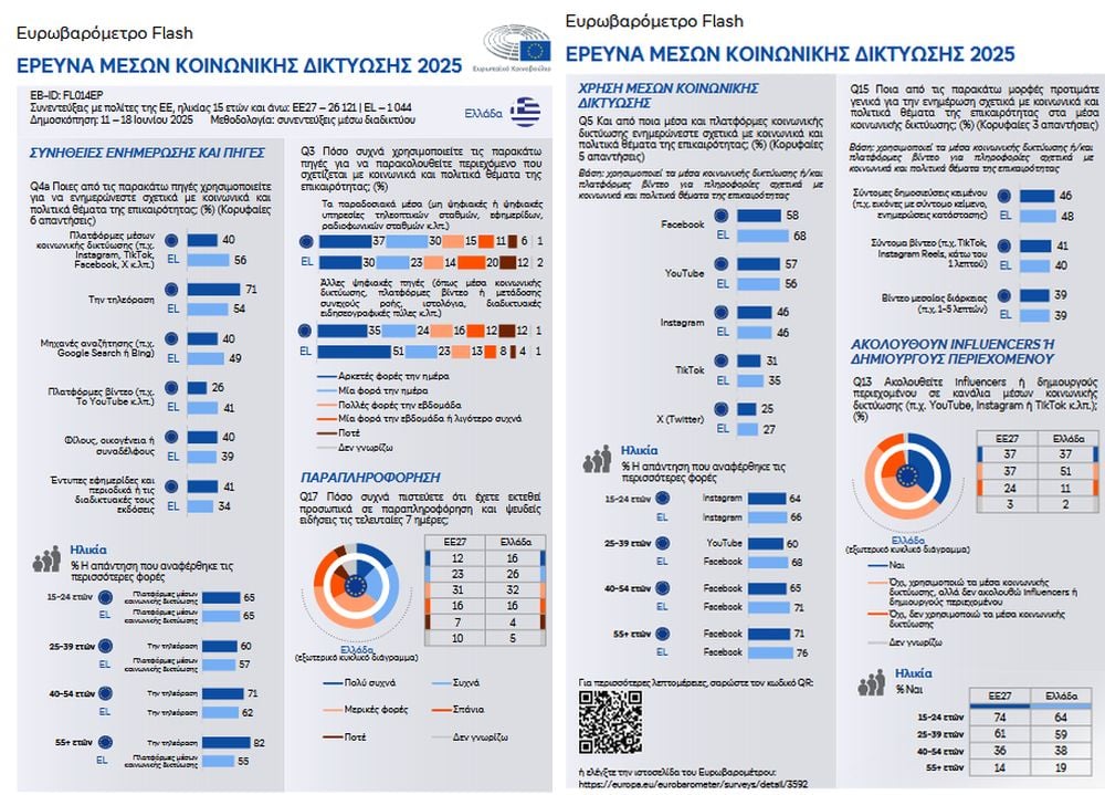 Η έρευνα από το Ευρωβαρόμετρο Flash «Social Media Survey 2025» του Ευρωπαϊκού Κοινοβουλίου κατέδειξε ότι στην Ελλάδα η πλειοψηφία των χρηστών του διαδικτύου ενημερώνεται κυρίως από τα μέσα κοινωνικής δικτύωσης (social media) και από την τηλεόραση.