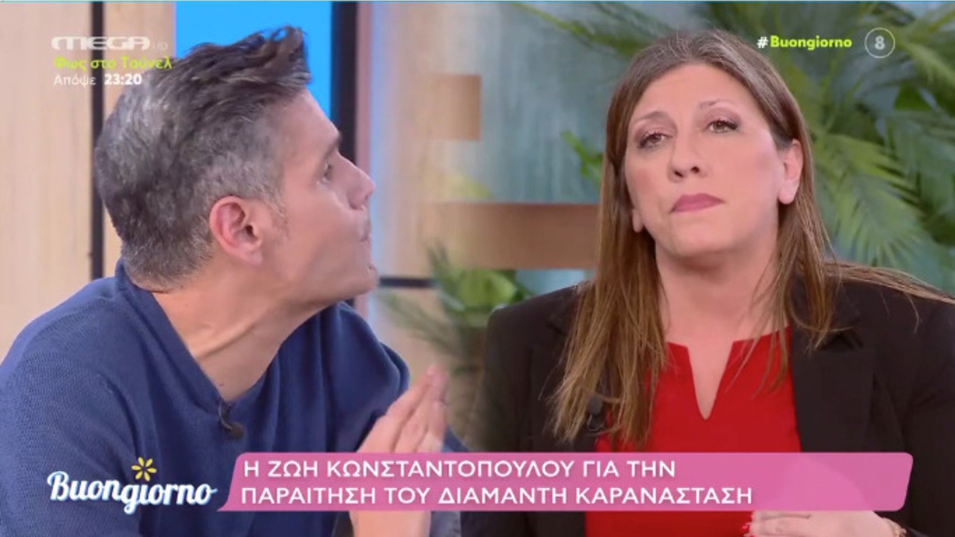 Πανικός προκλήθηκε στον αέρα της εκπομπής «Buongiorno» που ήταν καλεσμένη η πρόεδρος της «Πλεύης Ελευθερίας» Ζωή Κωνσταντοπούλου μεταξύ της ιδίας και του Δημήτρη Ουγγαρέζου αναφορικά με την παραίτηση του Διαμαντή Καρανάσταση από το βουλευτικό αξίωμα.