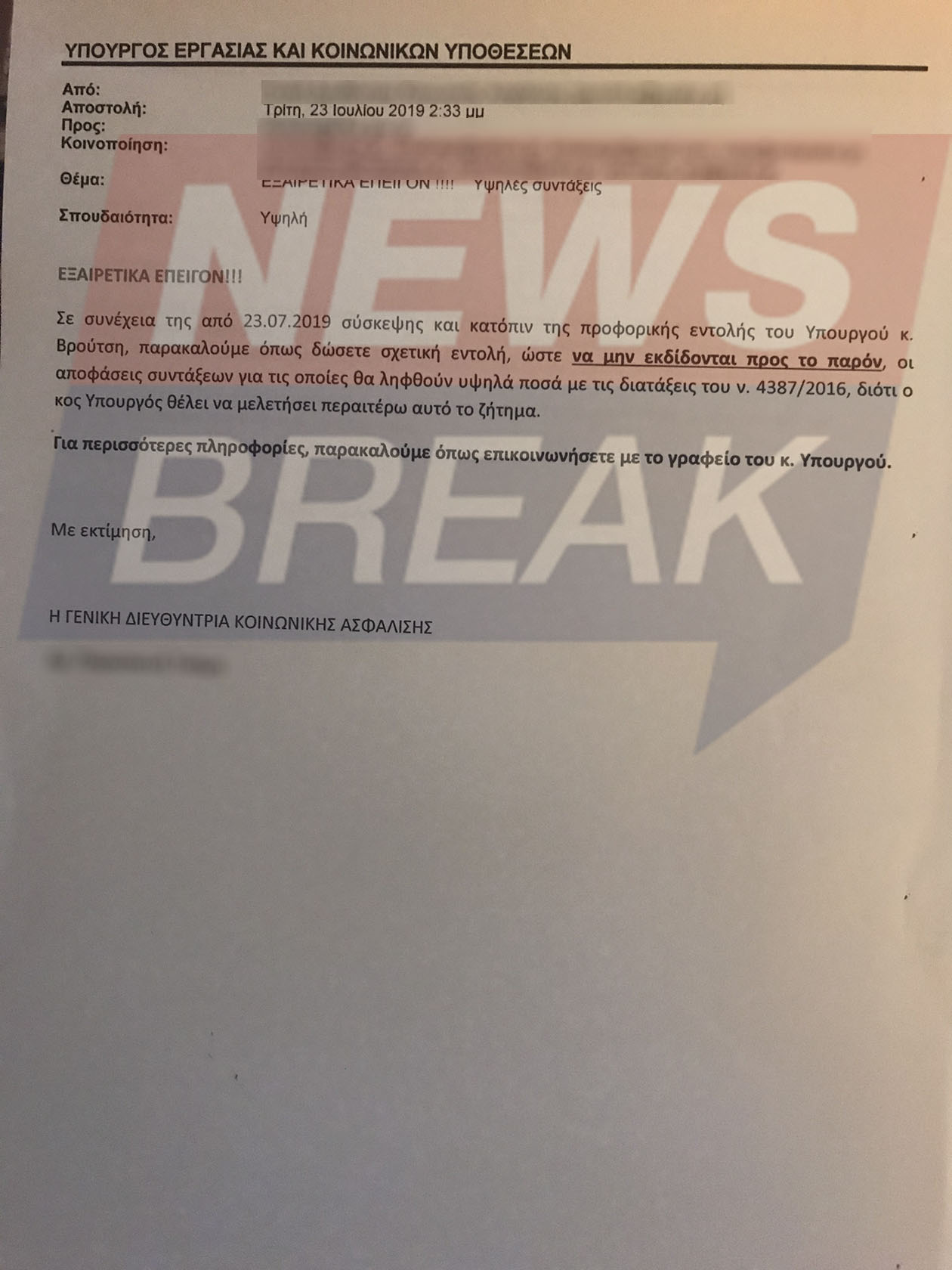 Το newsbreak.gr αποκαλύπτει σήμερα τα έγγραφα-φωτιά, με τα οποία ο Υπουργός Εργασίας Γιάννης Βρούτσης έδωσε την εντολή να μην δοθεί ποτέ η σύνταξη των 24.000 ευρώ. Μάλιστα ο συγκεκριμένος άνθρωπος που θα έπαιρνε 23.571 ευρώ, είχε οφειλές 38,4 ευρώ!