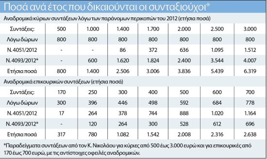 Aναδρομικά από 800 έως περίπου 9.000 ευρώ ετησίως, ανάλογα με το ύψος της αρχικής σύνταξής τους, πρέπει να επιστραφούν στους «απόμαχους της εργασίας» για τη χρονική περίοδο από τα μέσα του 2015 και μετά, λόγω της παράνομης κατάργησης των δώρων και των αντισυνταγματικών περικοπών στις κύριες και τις επικουρικές το 2012 (ανεξάρτητα από την απόφαση του ΣτΕ για τον νόμο Κατρούγκαλου).