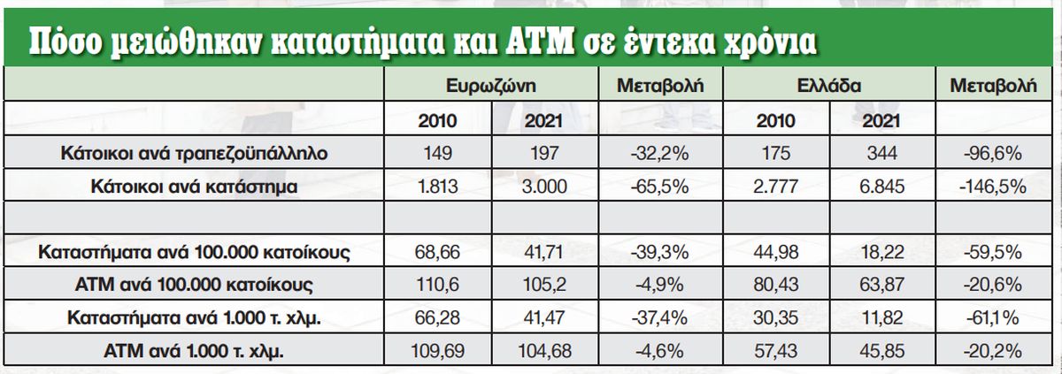 Σύμφωνα με τα στοιχεία, που δεν επιδέχονται αμφισβήτησης, ο αριθμός των καταστημάτων στην ευρωζώνη μειώθηκε από το 2010 έως το 2011 κατά 37,4% και στην Ελλάδα το ίδιο διάστημα κατά 61%. Ταυτόχρονα, ο αριθμός των ΑΤΜ το ίδιο διάστημα στην ευρωζώνη μειώθηκε κατά 10,2% και στη χώρα μας κατά 33,3%. Τέλος, ο αριθμός των τραπεζοϋπαλλήλων μειώθηκε στις χώρες της ζώνης του ευρώ κατά 18,6%, όμως στην Ελλάδα έγινε «σφαγή»: από 63.408 εργαζομένους σε τράπεζες το 2010, έχουν απομείνει μόλις 30.998, δηλαδή μειώθηκαν κατά 51,1%.
