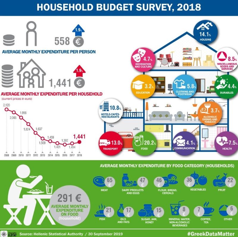 Βάσει της έρευνας οικογενειακών προϋπολογισμών της Ελληνικής Στατιστικής Αρχής, το 50% των νοικοκυριών δαπανά περισσότερα από 1.158 ευρώ τον μήνα.