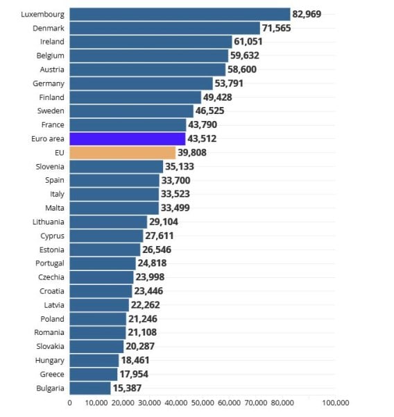 Ο μέσος ετήσιος μισθός ανά εργαζόμενο στην ΕΕ είναι 39.808 ευρώ – πάνω από το διπλάσιο του ελληνικού μισθού. Μεταξύ των χωρών της ΕΕ, κυμαίνεται από 15.387 ευρώ στη Βουλγαρία έως 82.969 ευρώ στο Λουξεμβούργο, που είναι 5,4 φορές υψηλότερος.