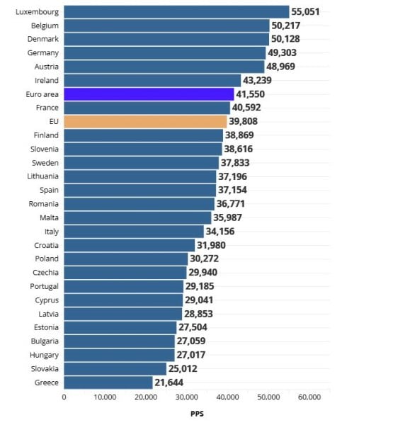 Το χάσμα μειώνεται όταν μετριέται σε επίπεδο αγοραστικής δύναμης, πράγμα που σημαίνει ότι λαμβάνονται υπόψη οι διαφορές στο κόστος ζωής μεταξύ των εθνών. Μία μονάδα PPS μπορεί θεωρητικά να αγοράσει την ίδια ποσότητα αγαθών και υπηρεσιών σε κάθε χώρα. Οι προσαρμοσμένοι μισθοί πλήρους απασχόλησης κυμαίνονται από 21.644 στην Ελλάδα έως 55.051 στο Λουξεμβούργο. Η αναλογία μεταξύ του υψηλότερου και του χαμηλότερου μειώνεται στο 2,5 – αλλά η Ελλάδα παραμένει στον πάτο. Εκτός από το Λουξεμβούργο, οι χώρες με την υψηλότερη κατάταξη είναι το Βέλγιο, η Δανία, η Γερμανία και η Αυστρία, με συνολικά έσοδα άνω των 48.500 ΜΑΔ. Οι πέντε χώρες με το χαμηλότερο ποσοστό είναι η Ελλάδα, η Σλοβακία, η Ουγγαρία, η Βουλγαρία και η Εσθονία, όλες κάτω από 28.000 ΜΑΔ – με την Ελλάδα να κρατά τη θλιβερή πρώτη θέση από το τέλος.
