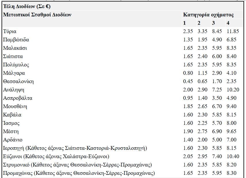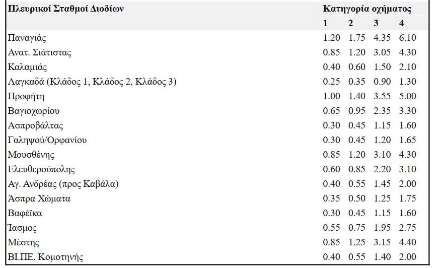 Αναλυτικά, οι τιμές ανά μετωπικό και πλευρικό σταθμό διοδίων θα διαμορφωθούν ως εξής: