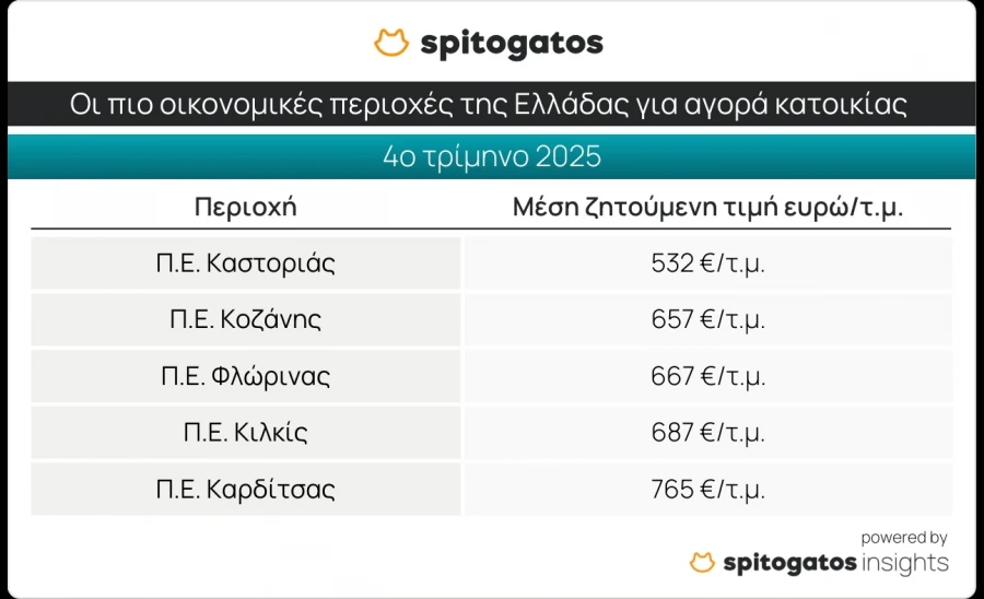Οι πιο οικονομικές περιοχές είναι η Περιφερειακή Ενότητα Καστοριάς (532 ευρώ / τετραγωνικό μέτρο), Κοζάνης, Φλώρινας, Κιλκίς και Καρδίτσας.