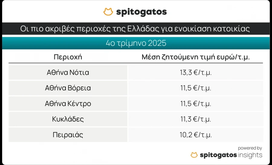 Τα Νότια Προάστια παραμένουν η πιο «τσιμπημένη» περιοχή με μέση ζητούμενη τιμή τα 4.125 ευρώ / τετραγωνικό μέτρο, ενώ, ακολουθούν οι Κυκλάδες και τα Βόρεια Προάστια.