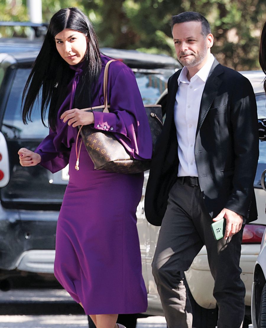 Φορώντας μοβ πουκάμισο με φιόγκο στον λαιμό, συνδυασμένο με ψηλόμεση μίνι φούστα στο ίδιο χρώμα (όντως, πολύ κομψός συνδυασμός), υπέπεσε σε ένα μικρό στιλιστικό «φάουλ», που δεν ήταν άλλο από τη μεγάλη shopping τσάντα Louis Vuitton! Να μας συγχωρεί η αρραβωνιαστικιά του κ. Δούκα, αλλά η εν λόγω τσάντα δεν ταιριάζει στο ντύσιμο και το συγκεκριμένο μυστήριο. Θα ήταν προτιμότερο να διάλεγε το αντίστοιχο μικρό τσαντάκι του γαλλικού οίκου!