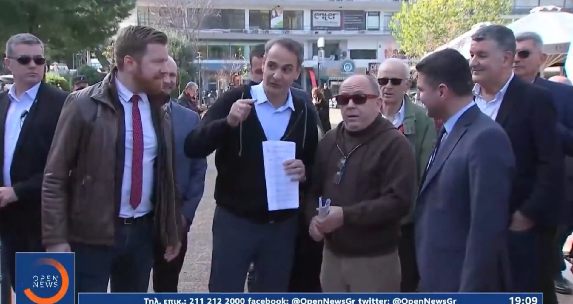 Πολίτης που συνάντησε τυχαία ο Κυριάκος σε δρόμο, έτυχε να είχε μαζί του τα παραστατικά, που αποδεικνύουν ότι τυχαία την προηγούμενη μέρα πριν συναντήσει τον Κυριάκο, έτυχε να ικανοποιηθεί από μία νομοθετική πρωτοβουλία της κυβέρνησης του Κυριάκου. Ήταν τόσο ικανοποιημένος που έτυχε να κρατάει τα χαρτιά πάνω του επί 24 ώρες με αποτέλεσμα να μπορέσει να εκφράσει την ικανοποίησή του στον πρωθυπουργό σας ζωντανή μετάδοση.