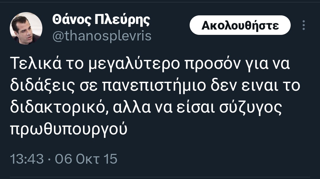 Aνερυθρίαστα ο Θάνος Πλεύρης σηκώνει το δάχτυλο και παραδίδει μαθήματα πολιτικού πολιτισμού. Ο πρώην υπουργός κάνει λόγο για σεξιστική επίθεση της Έλενας Ακρίτα στην σύζυγο του πρωθυπουργού. Ο τιμητής με μνήμη χρυσόψαρου και καταγέλαστη υποκρισία εγκαλεί τον ΣΥΡΙζΑ για κατασυκοφάντηση επί μια 10ετία της Μαρέβας Γκραμπόφσκι και γράφει: