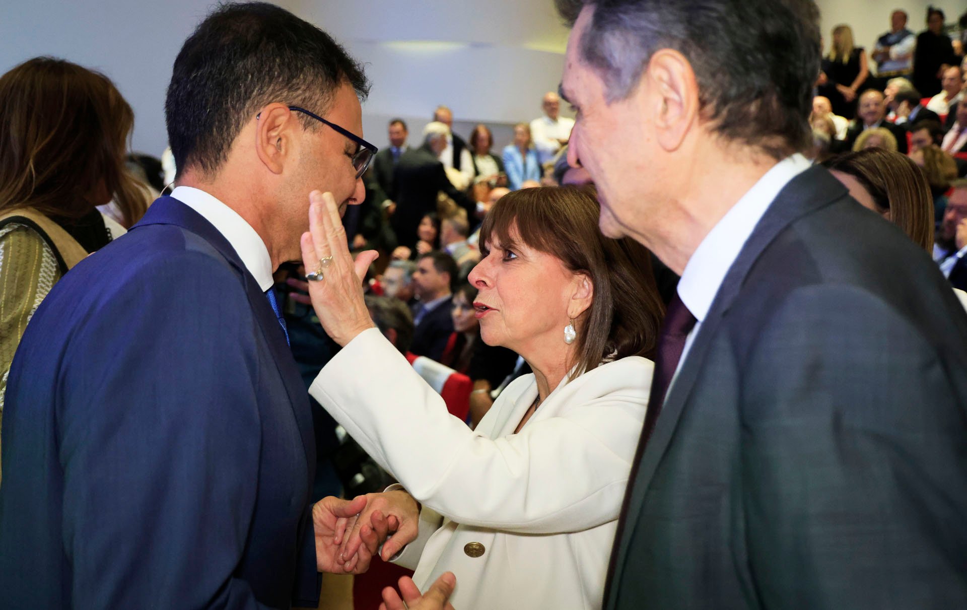 Παρούσα και η πρώην Πρόεδρος της Δημοκρατίας, Κατερίνα Σακελλαροπούλου, που δεν έκρυψε τη χαρά της που είδε τον Πατέλη.