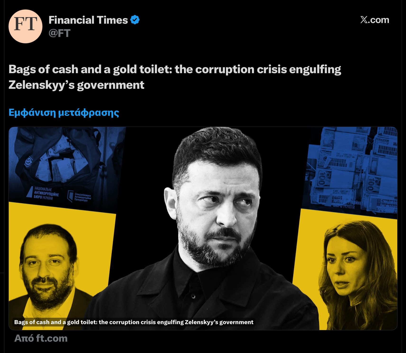 Όταν οι Financial Times κάνουν λόγο για «χρυσούς καμπινέδες» και «τσουβάλια με δολάρια», η επίκληση της «σωστής πλευρά της ιστορίας» πάει περίπατο και τα ερωτήματα πολλαπλασιάζονται: «Τι δουλειά έχει ένας διεφθαρμένος στο Μέγαρο Μαξίμου σε μια εξαιρετικά αρνητική συγκυρία»;