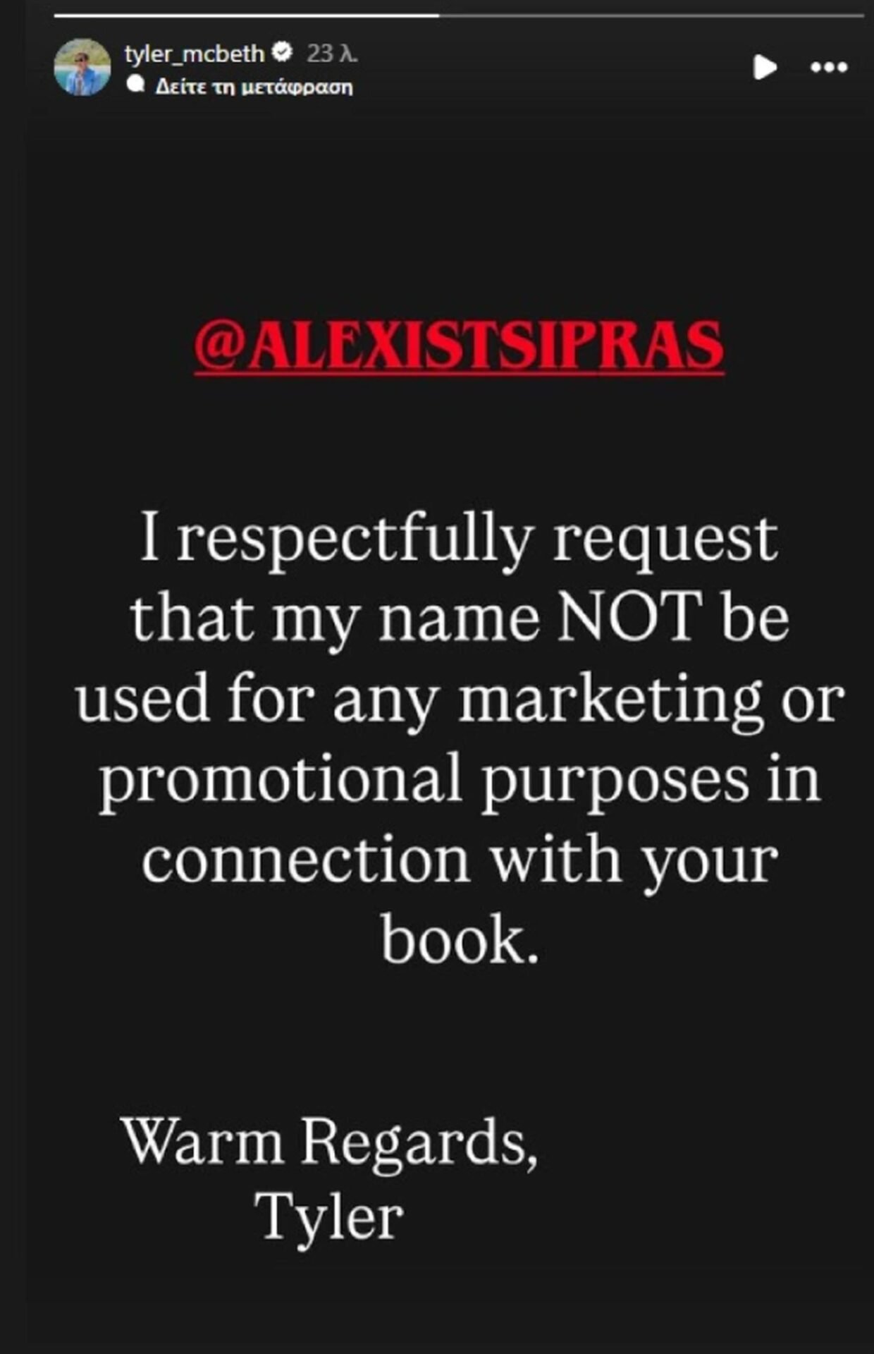 Με story που ανέβασε στο Instagram, ο σύζυγος του Στέφανου Κασσελάκη απαντά στον πρώην πρωθυπουργό: «Με όλο το σεβασμό, ζητώ να μην χρησιμοποιηθεί το όνομά μου για οποιονδήποτε σκοπό μάρκετινγκ ή προώθησης σε σχέση με το βιβλίο σας. Με θερμούς χαιρετισμούς, Τάιλερ».