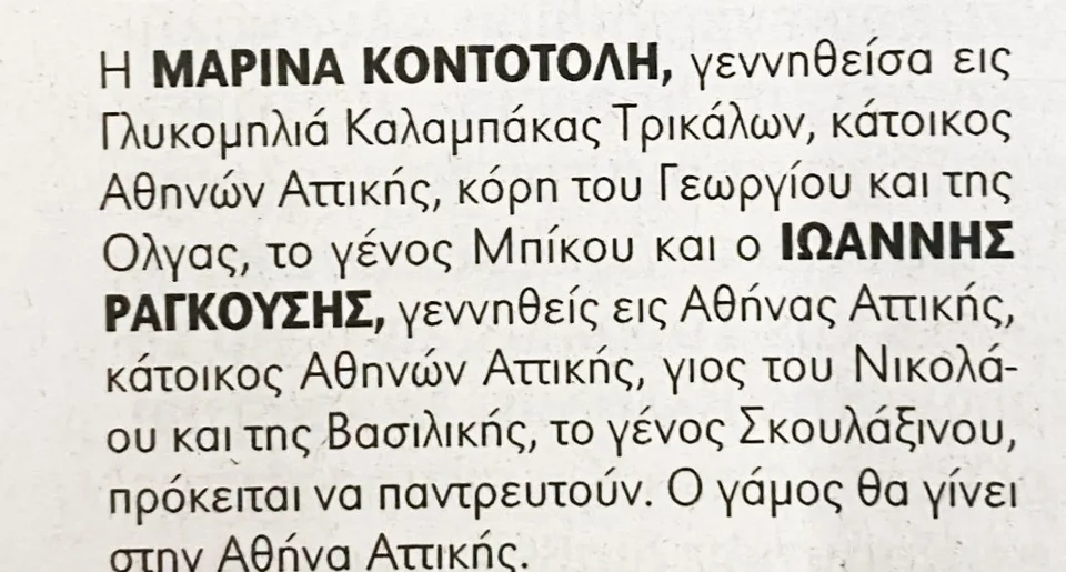 Η αναγγελία του γάμου τους δημοσιεύτηκε στην στην εφημερίδα «Καθημερινή» και ο γάμος τους θα τελεστεί στην Αθήνα.