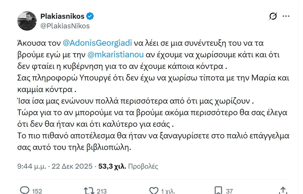 Ο Νίκος Πλακιάς απάντησε με οξύτητα στον Άδωνι Γεωργιάδη, έπειτα από τη δημόσια παρέμβαση του υπουργού που τον κάλεσε να επιλύσει τις διαφορές του με τη Μαρία Καρυστιανού.