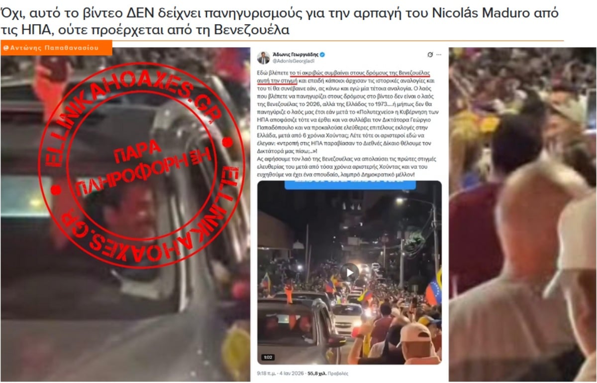 «Εδώ βλέπετε το τί ακριβώς συμβαίνει στους δρόμους της Βενεζουέλας αυτή την στιγμή και επειδή κάποιοι άρχισαν τις ιστορικές αναλογίες και του τί θα συνέβαινε εάν, ας κάνω και εγώ μία τέτοια αναλογία. Ο λαός που βλέπετε να πανηγυρίζει στους δρόμους στο βίντεο δεν είναι ο λαός της Βενεζουέλας το 2026, αλλά της Ελλάδος το 1973….ή μήπως δεν θα πανηγύριζε ο λαός μας έτσι εάν μετά το “Πολυτεχνείο” η Κυβέρνηση των ΗΠΑ αποφάσιζε τότε να έρθει και να συλλάβει τον Δικτάτορα Γεώργιο Παπαδόπουλο και να προκαλούσε ελεύθερες επιτέλους εκλογές στην Ελλάδα, μετά από 6 χρόνια Χούντας; Λέτε τότε οι αριστεροί εδώ να έλεγαν: “ντροπή στις ΗΠΑ παραβίασαν το Διεθνές Δίκαιο θέλουμε τον Δικτάτορά μας πίσω;..”! Ας αφήσουμε τον λαό της Βενεζουέλας να απολαύσει τις πρώτες στιγμές ελευθερίας του μετά από τόσα χρόνια αριστερής Χούντας και να του ευχηθούμε να έχει ένα σπουδαίο, λαμπρό Δημοκρατικό μέλλον!», αναφέρει ο Άδωνις στο συνοδευτικό κείμενο.