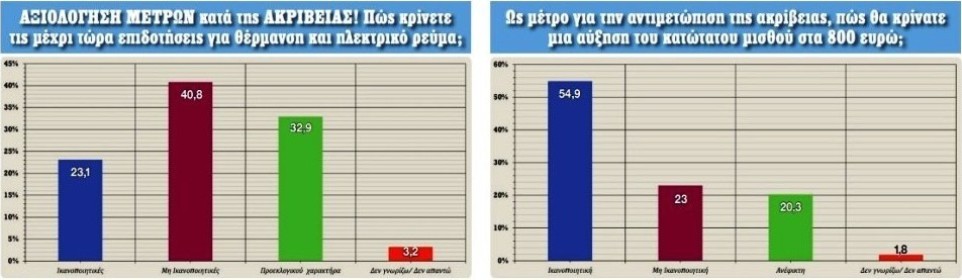 Πολύ χαμηλή φαίνεται ότι είναι η απήχηση της μέχρι τώρα αντιμετώπισης της ακρίβειας από την κυβέρνηση, μέσω των επιδομάτων για θέρμανση και ηλεκτρικό ρεύμα, τα οποία κρίνονται ικανοποιητικά μόνο από το 23% του εκλογικού σώματος. Το ποσοστό αυτό, μάλιστα, είναι μικρότερο του 5% για όλα τα κόμματα της αντιπολίτευσης, πλην του ΚΙΝ.ΑΛ., ενώ μόνο οι ψηφοφόροι της Ν.Δ. δείχνουν μια πλειοψηφική αποδοχή (58%).