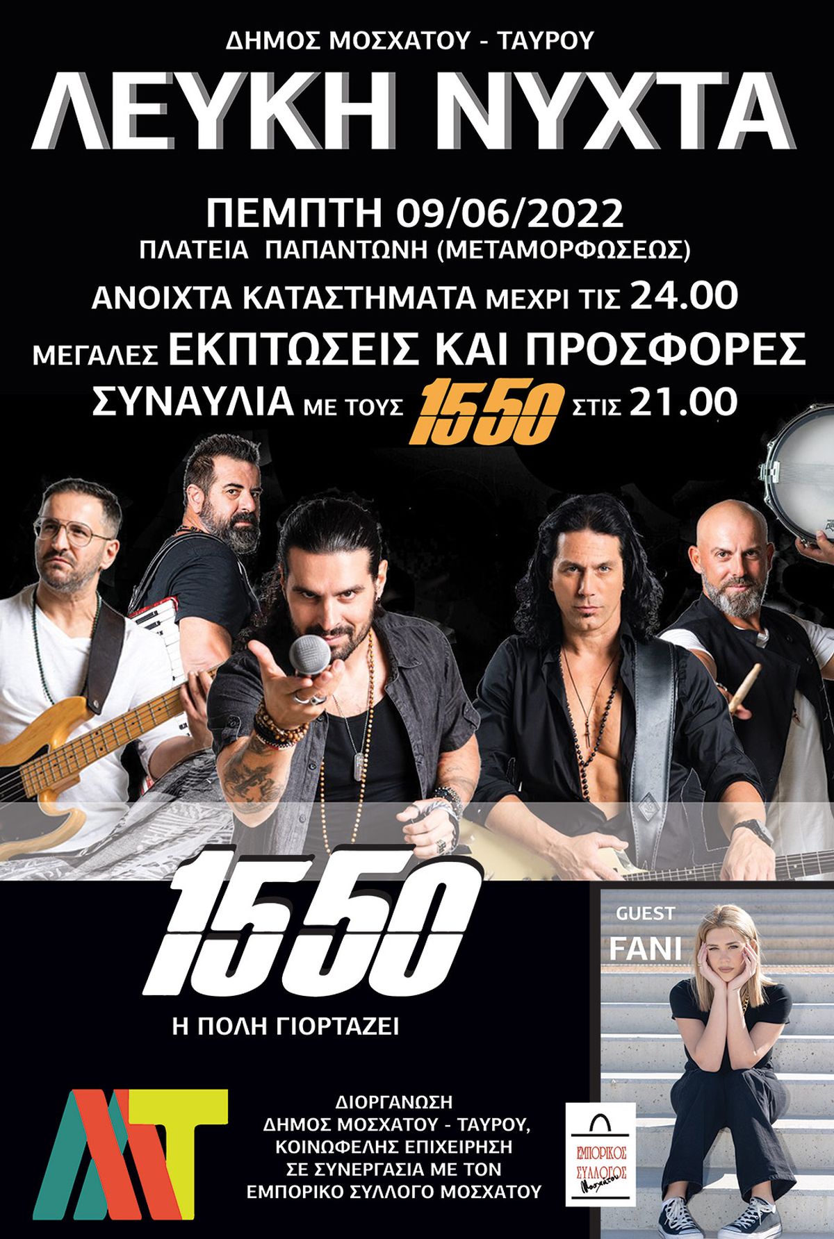 Στις 21:00, στην πλατεία «Ταξιάρχης Παπαντώνης» (Μεταμορφώσεως) θα πραγματοποιηθεί μεγάλη συναυλία με τους 1550 και guest star την Fani.