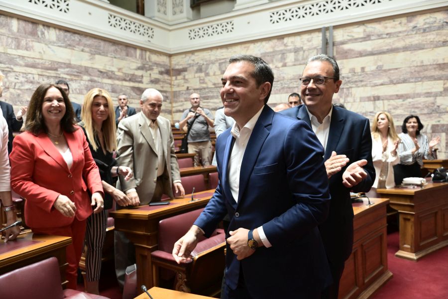 Ο πρώην πρόεδρος του ΣΥΡΙΖΑ συνομίλησε με άλλους βουλευτές, ενώ ο φακός τον απαθανάτισε να κάνει χειραψία με τηΝτόρα Μπακογιάννη.