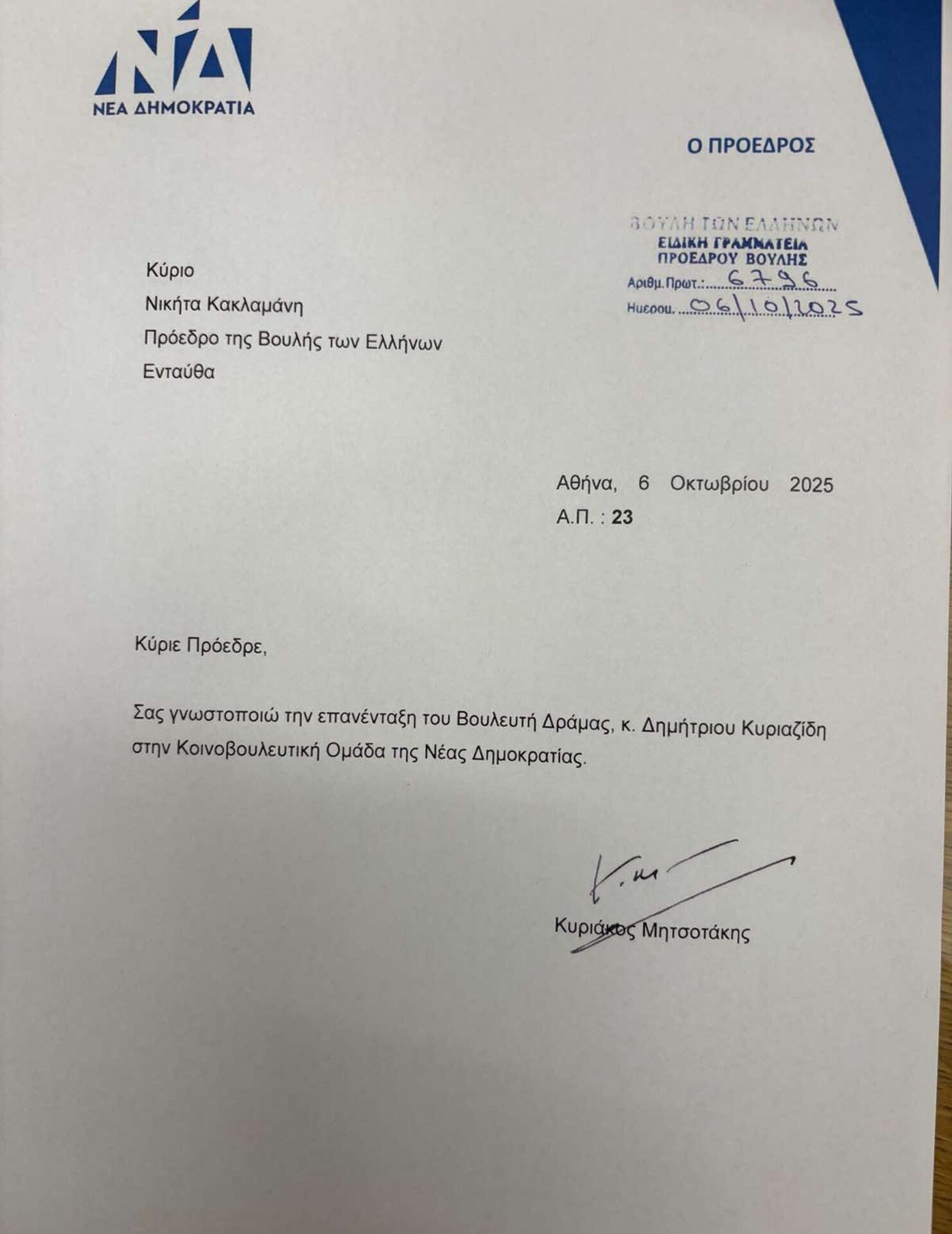Επανεντάχθη στην Κοινοβουλευτική Ομάδα της ΝΔ ο βουλευτής Δημήτρης Κυριαζίδης, ύστερα από απόφαση του Κυριάκου Μητσοτάκη.