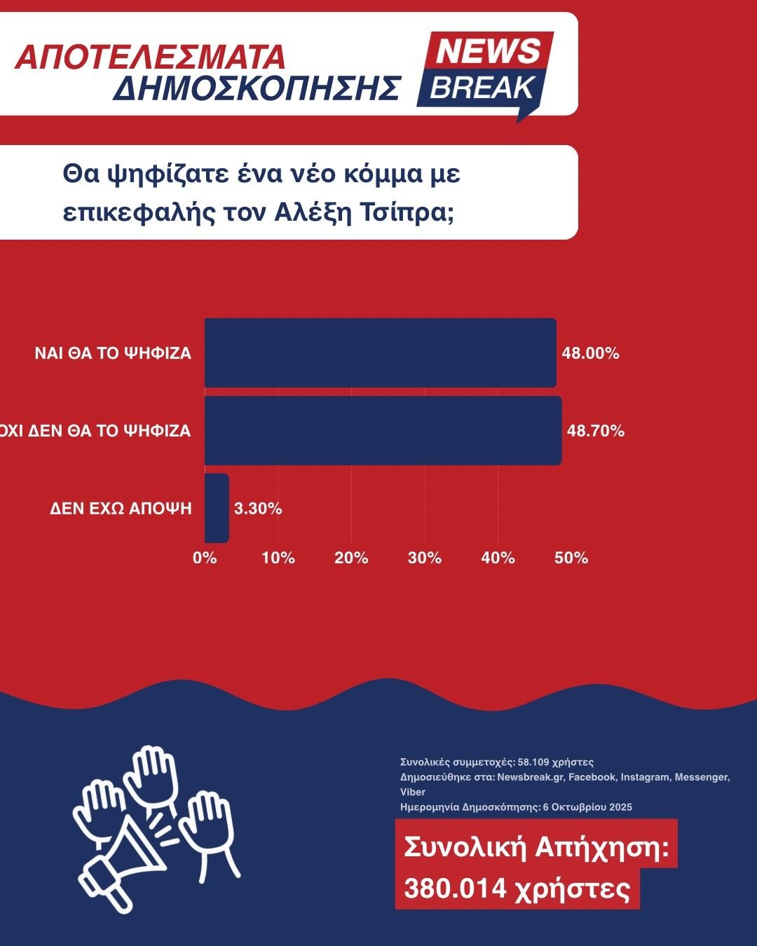 Έκπληξη προκαλούν τα αποτελέσματα της μεγάλης δημοσκόπησης του newsbreak.gr που δημοσιεύθηκε στην ιστοσελίδα και στα μέσα κοινωνικής δικτύωσης του μέσου, με αφορμή ιδρύσει δικό του πολιτικό φορέα.